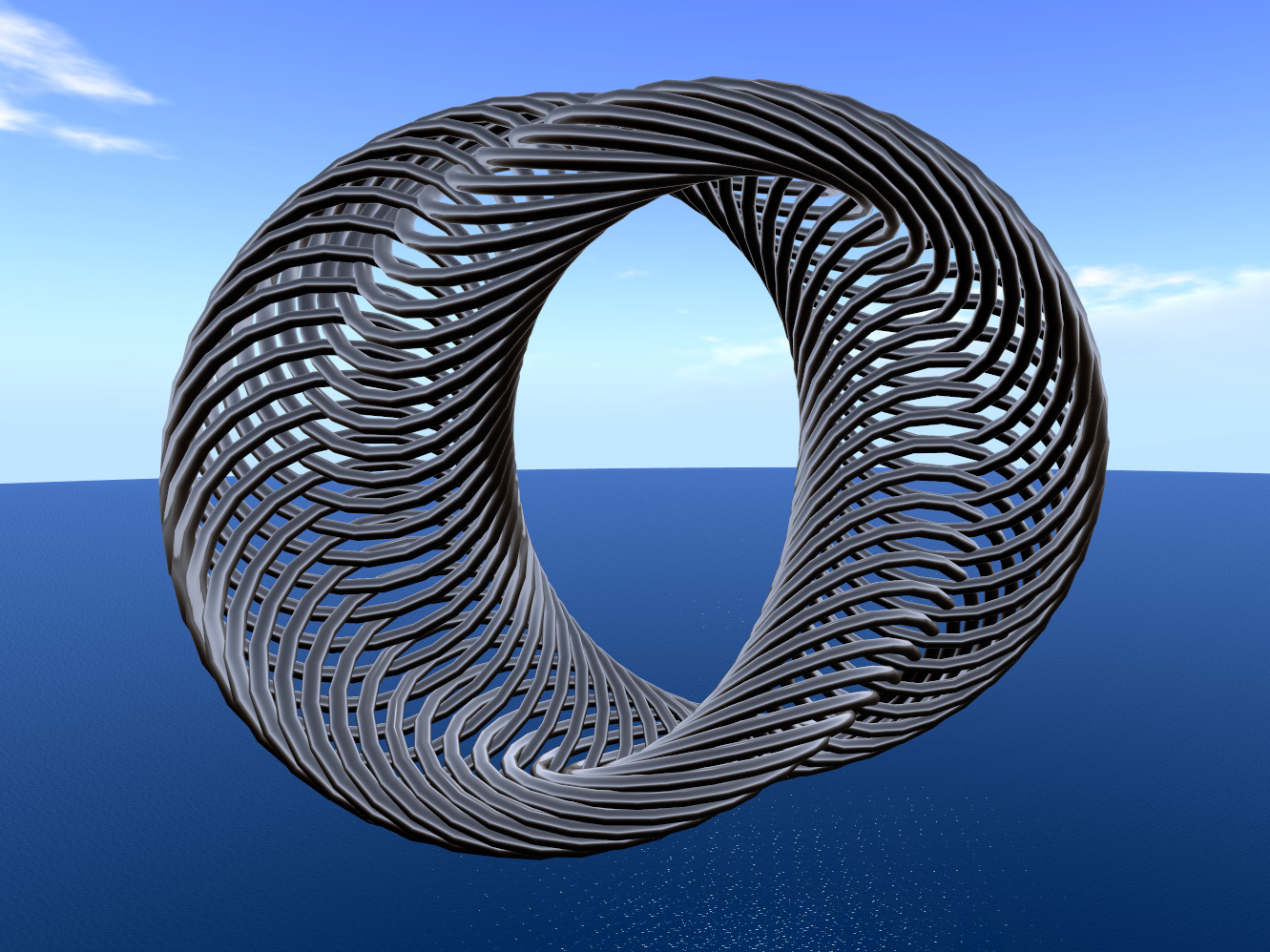 A sculpture created in Second Life. It is comprised entirely of tori arranged in a circle and rotated in a wave around the circle. Through pictures is really not the way to view the work. To really get a feel for it you have to be seeing it in 3D space.